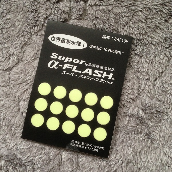 ただ、後ほど詳しく述べるが、白熱灯や夕日などの赤系暖色系の光では、高輝度蓄光テープが光を吸収できず、スーパーアルファフラッシュ・アルファフラッシュともに十分光ることができないのでご注意を。