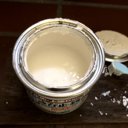 ↑ アトムハウスペイントの錆び止めペンキ缶の蓋を開くとこんな感じ。液体なので、あちこちにペンキが跳ねる。